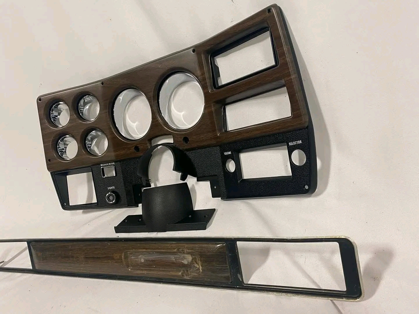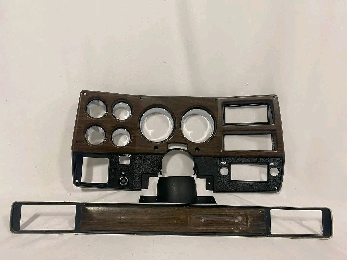 1973–1974 Chevy GMC Dash Bezel Kit with Chrome & Wood Grain Overlay – Includes Column Cover & OEM Passenger Plate