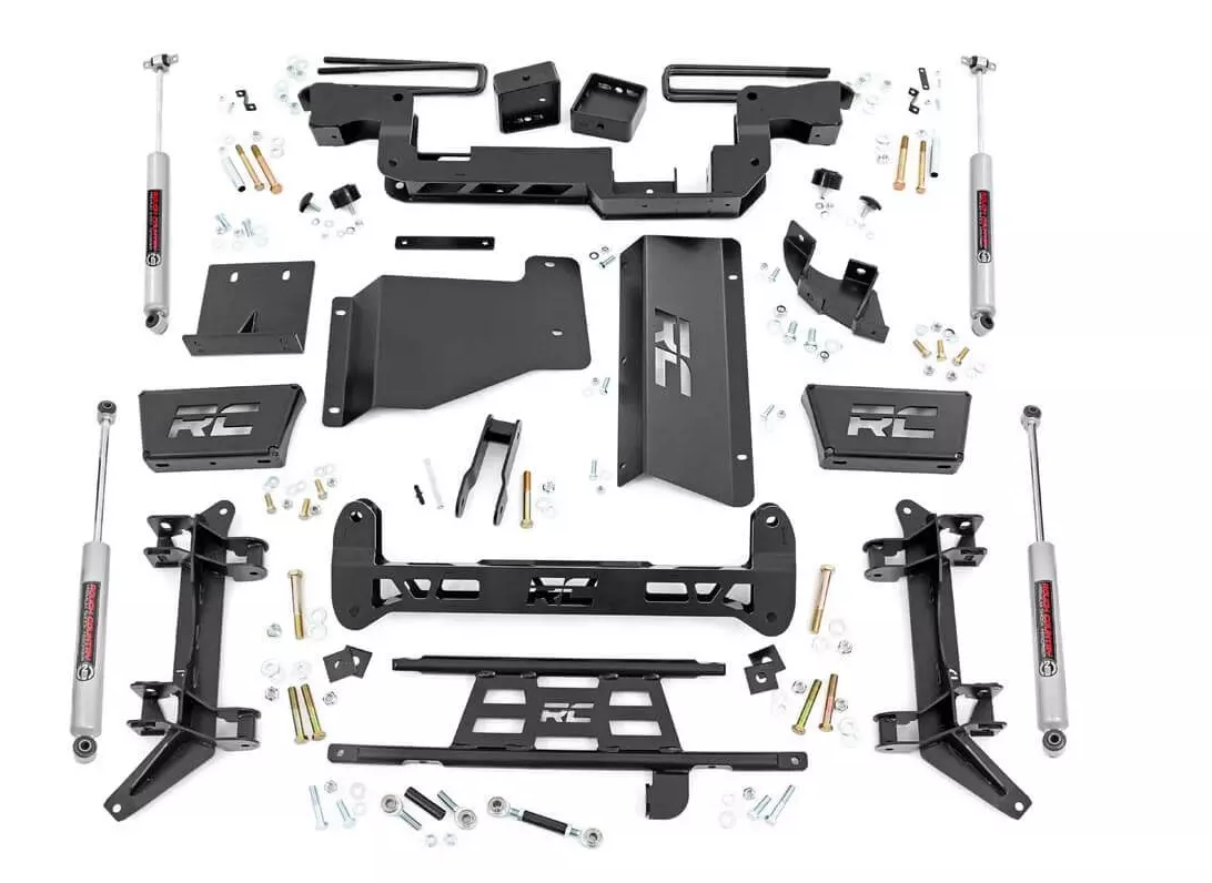 Each kit includes Rough Country’s N3 Shock Absorbers for a balanced performance of smooth highway ride quality and off-road performance. This high-quality kit features solid steel components powdercoated black to resist the elements and with laser-cut “RC” logos for killer, good looks.