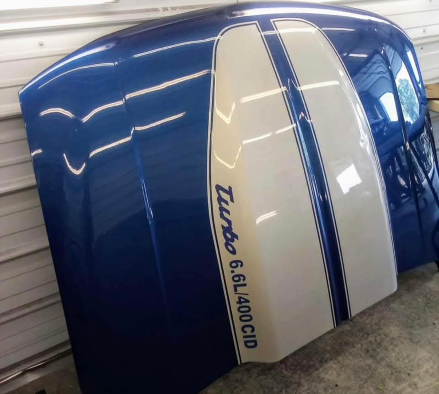 Give your Chevy or GMC a bold, retro muscle car vibe with this custom performance cowl induction hood, painted in a striking deep blue with white dual rally stripes and “6.6L/400 CID Turbo” callout.